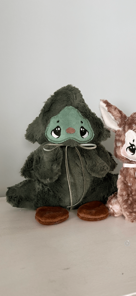 He is ~12 inches tall and weighs ~1lbs, perfect for cuddling. He’s handmade with premium Shannon minky fur and weighted with micro glass beads and poly pellets for extra weight and squish.